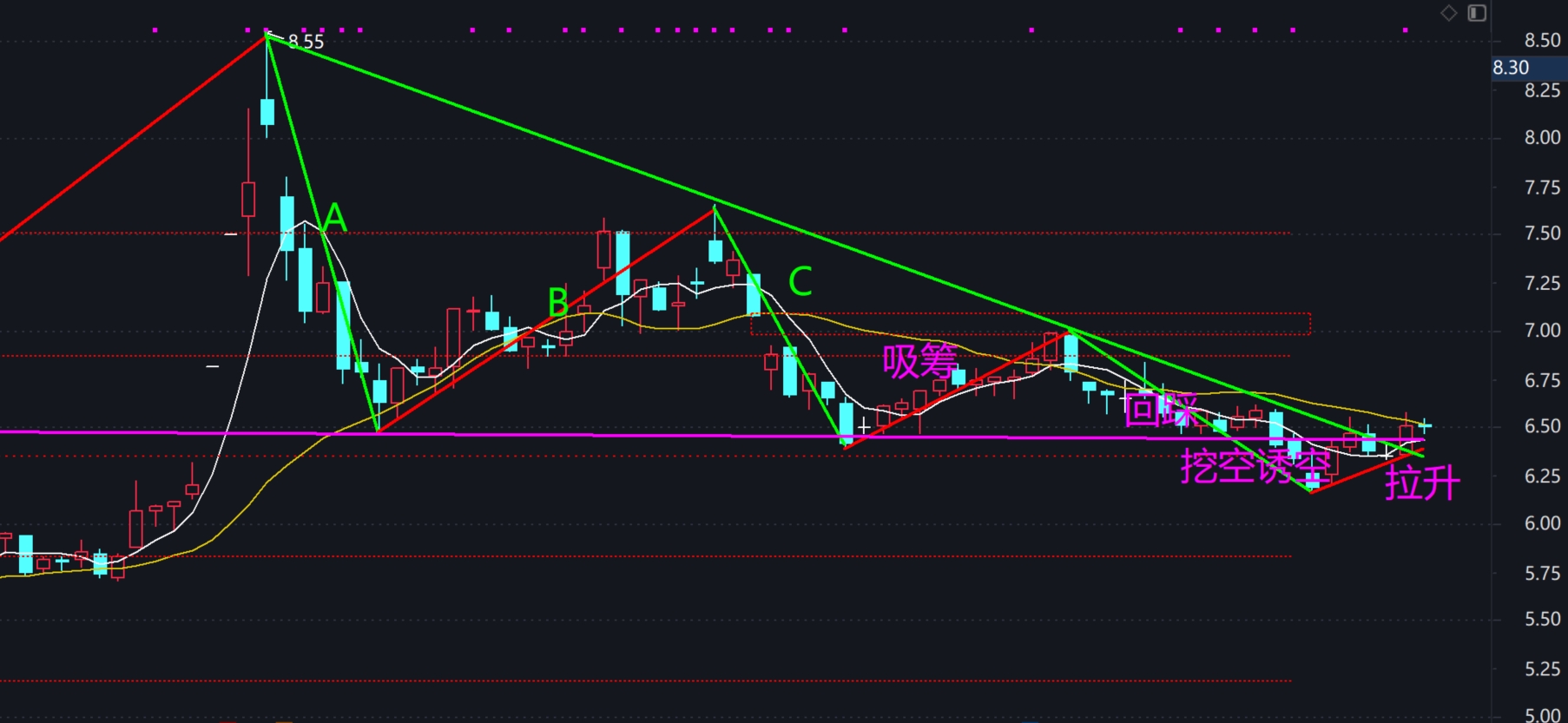 复盘了下上周的放量拉升突破了阻力位,变盘成功了,主要看6.47多次做的平台能不能