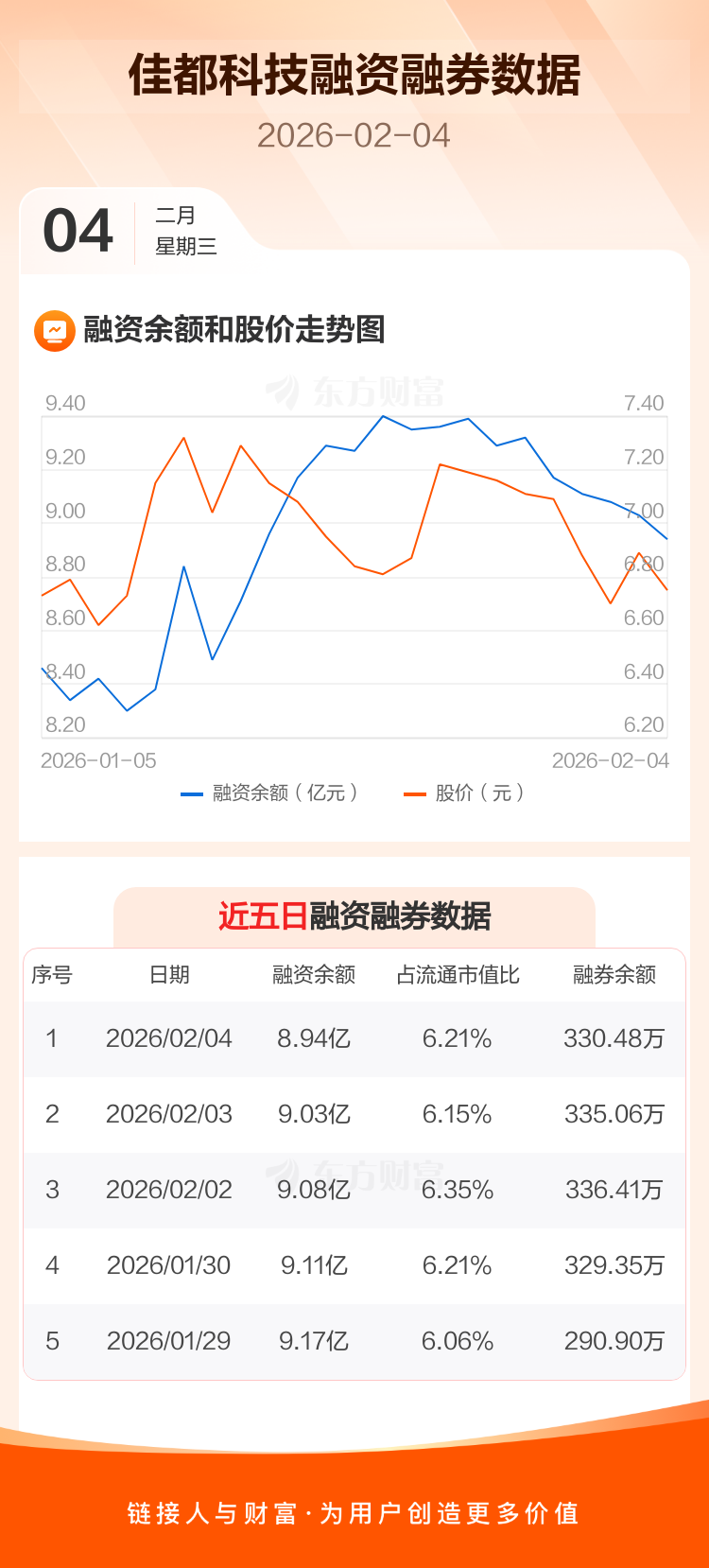 交易所最新数据显示,佳都科技于2026年2月4日获融资买入2563.37万元,融资偿还3465.34万元,当日融资净偿还901.98万元。目前,该股融资余额8.94亿,占流通市值比例为6.21%。