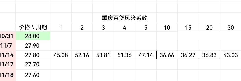 $重庆百货(SH600729)$ 目前各日周期风险系数如下图,此风险系数50作为分水岭,高于80为风险区,低于30才值得关注,低于20为安全区,此数据为价值波段操作参考,不适合短线。