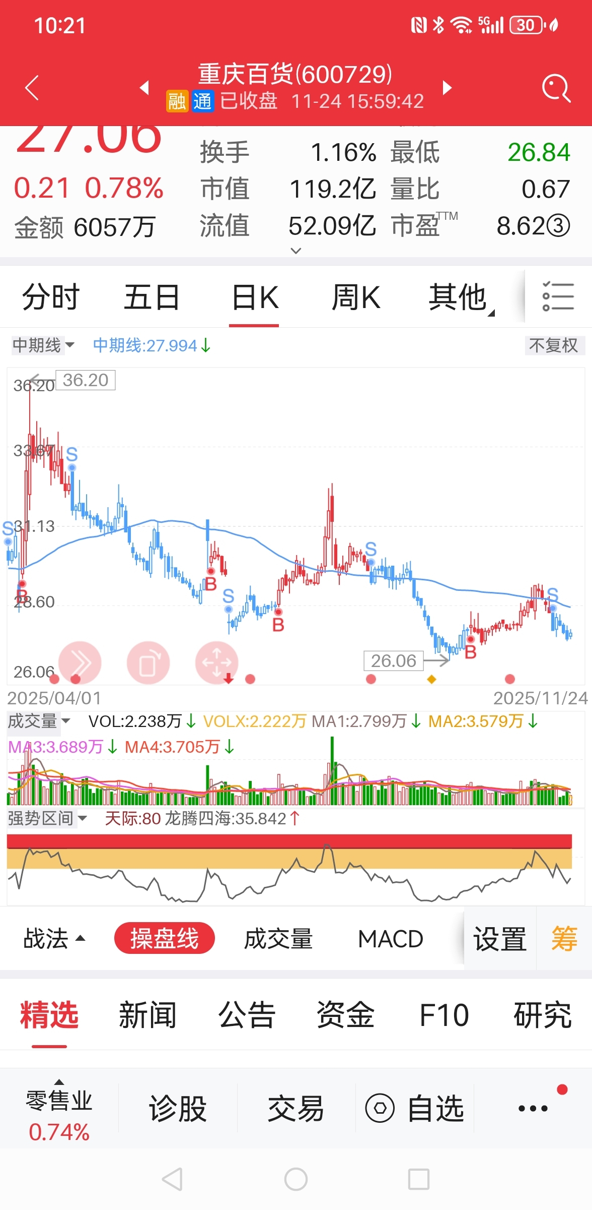 $重庆百货(SH600729)$ 各种指标显示,重庆百货目前是下跌状态,股友们一定小心!
