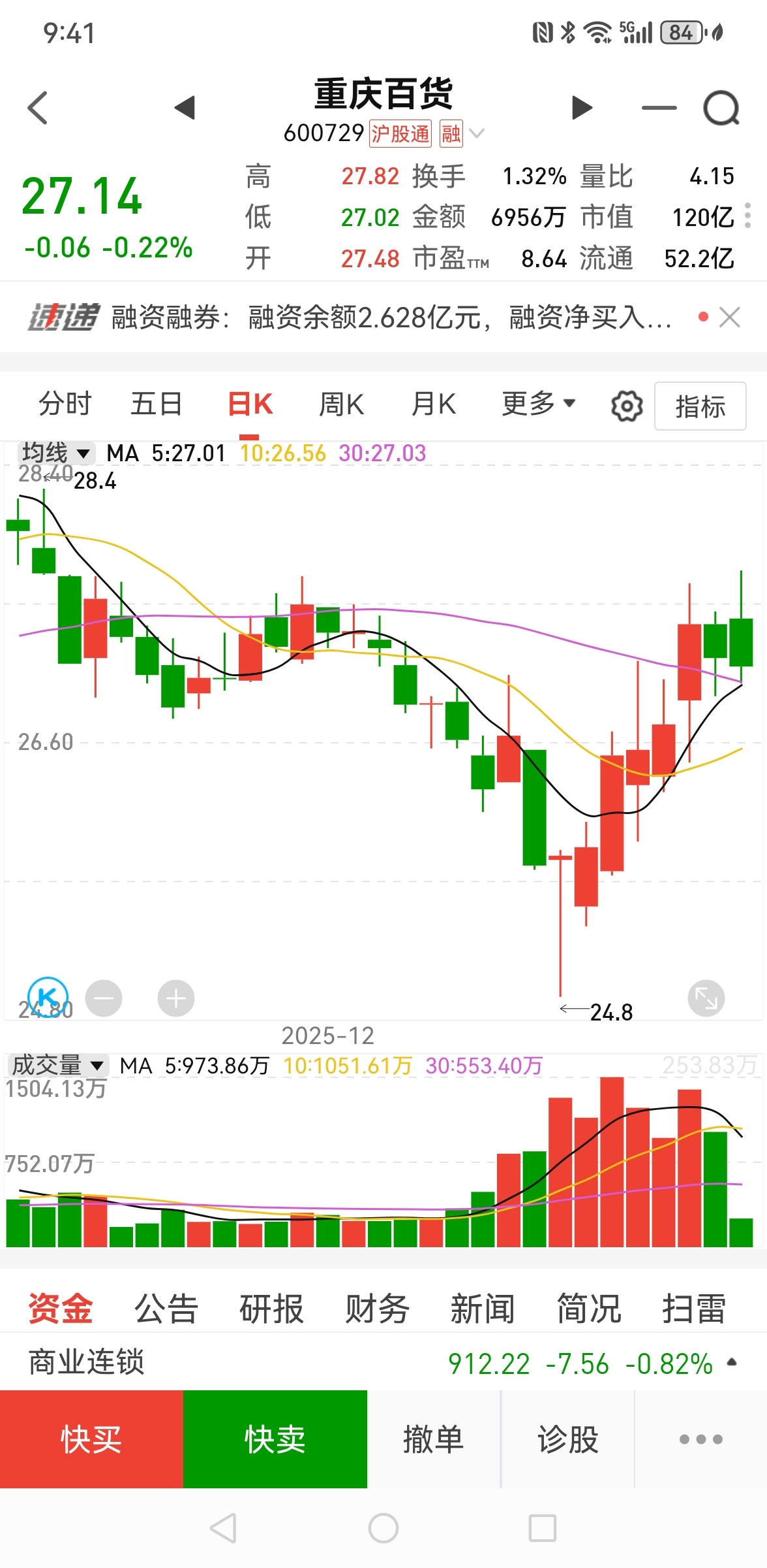 $重庆百货(SH600729)$ 把我昨天说话当,是不是今天融资盘获利了结!