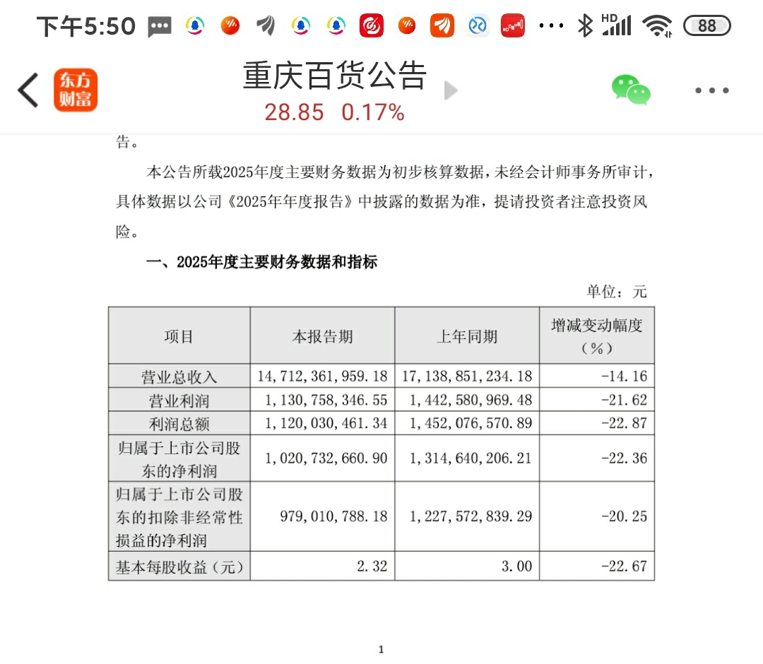 重庆百货25年利润同比下降22.87%年,每股收益同比下降22.67%