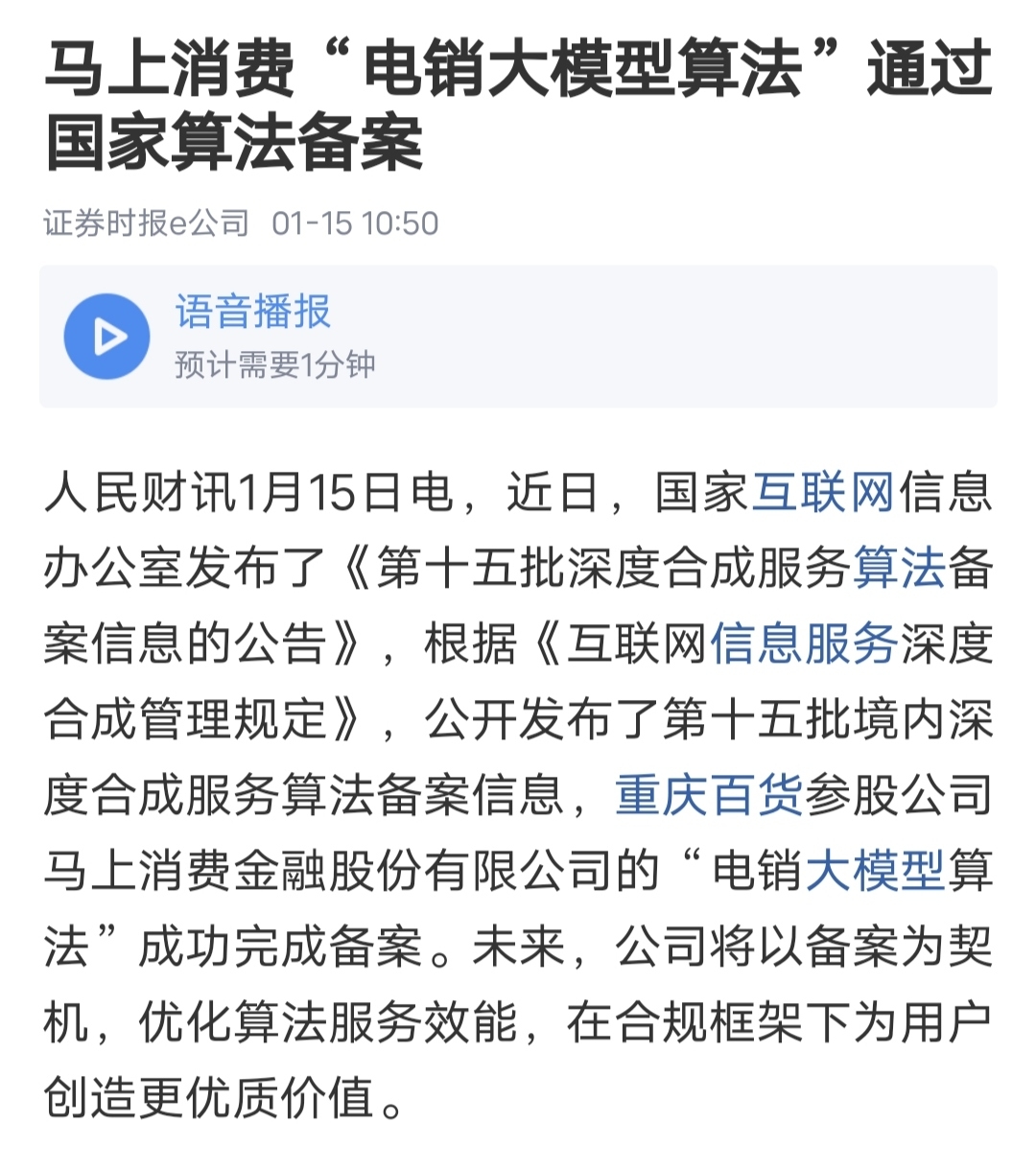 $重庆百货(SH600729)$ 马上消费 “电消大规模算法” 通过