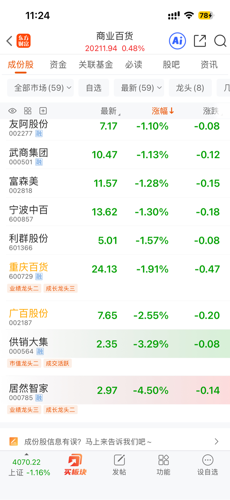 $重庆百货(SH600729)$ 这货就是板块倒数第一。底下三个跌的比重百多都是业绩大亏,重百没有利空没有其他消息,跌这么多,离谱至极。