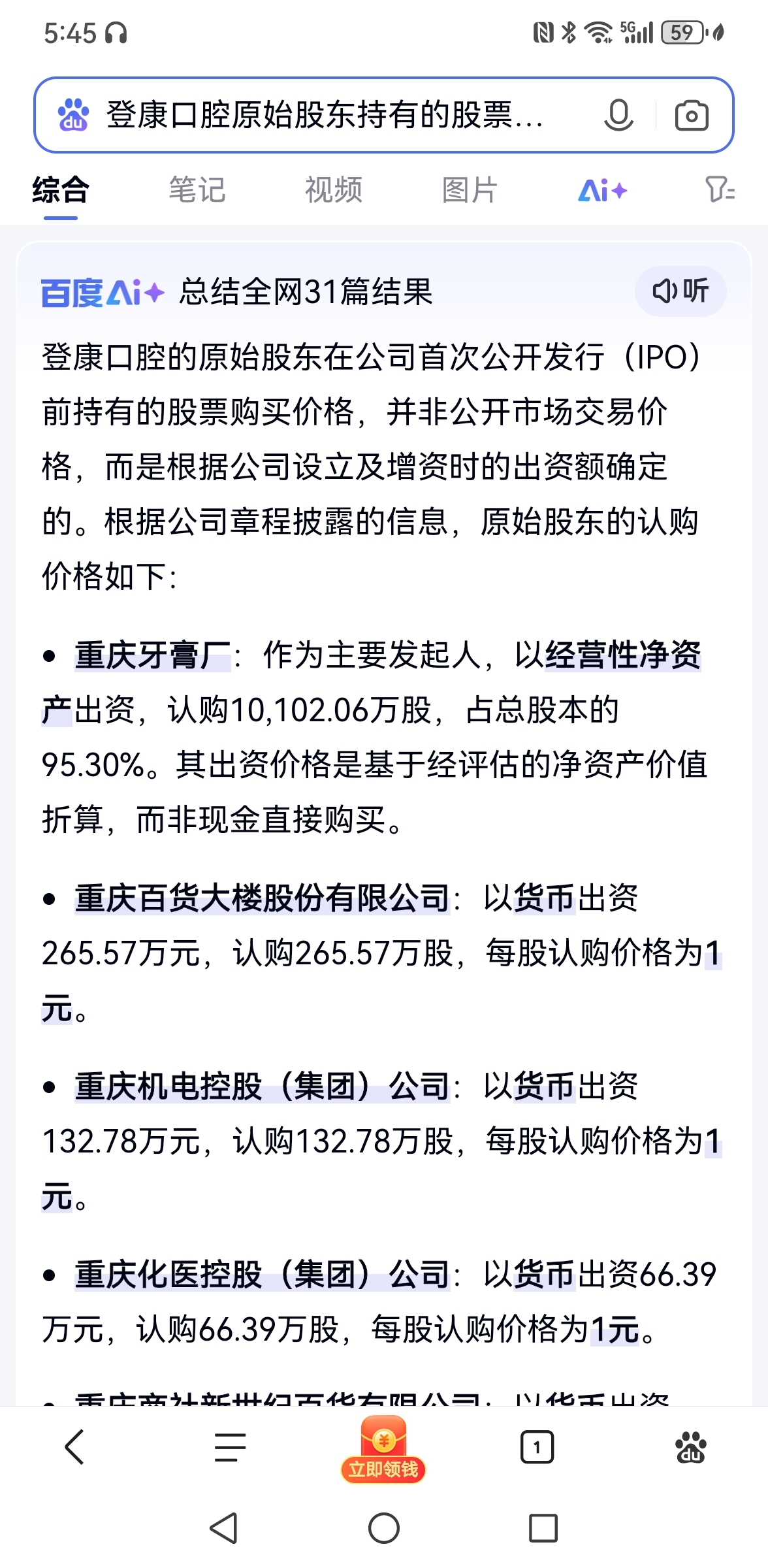 重庆百货但是持有等登康口腔原始股的购买价格是1元/股,一共购买了265.57万股