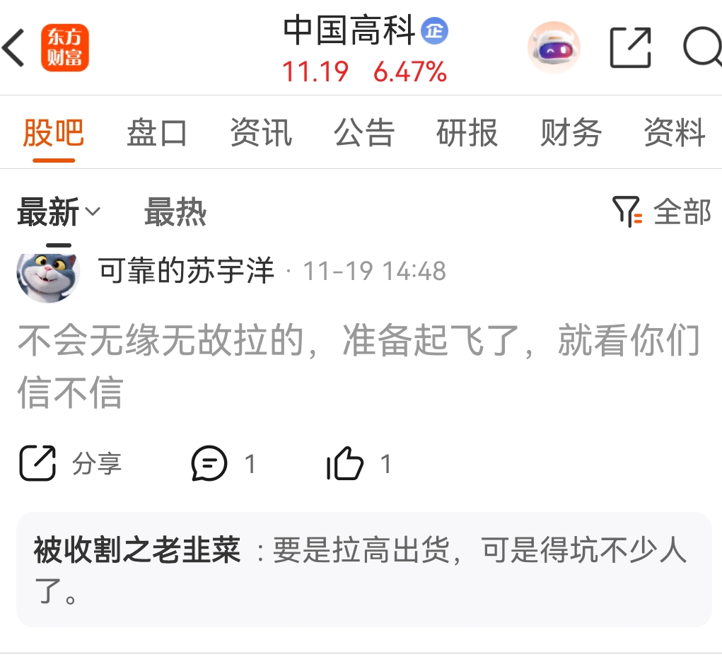 $中国高科(SH600730)$ 还是那句话不会无缘无故的拉升,准备起飞,就看你们信不信!