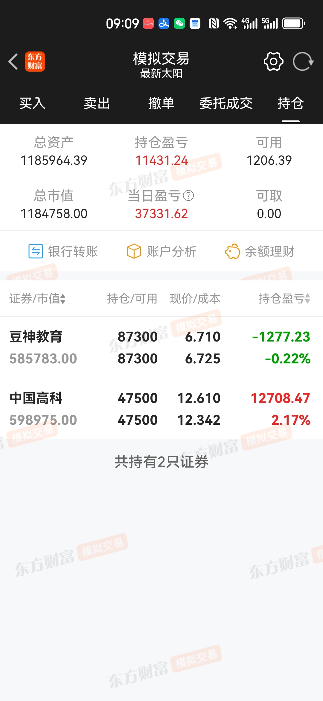 昨天模拟盘半仓追涨杀进了中国高科,半仓杀进豆神教育,因为看到在大盘成交量明显缩量