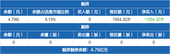 融资方面,当日融资买入0元,融资偿还1354.32万元,融资净偿还1354.32万元,连续5日净偿还累计4846.54万元。融券方面,融券卖出0股,融券偿还0股,融券余量0股,融券余额0元。融资融券余额合计4.79亿元。
