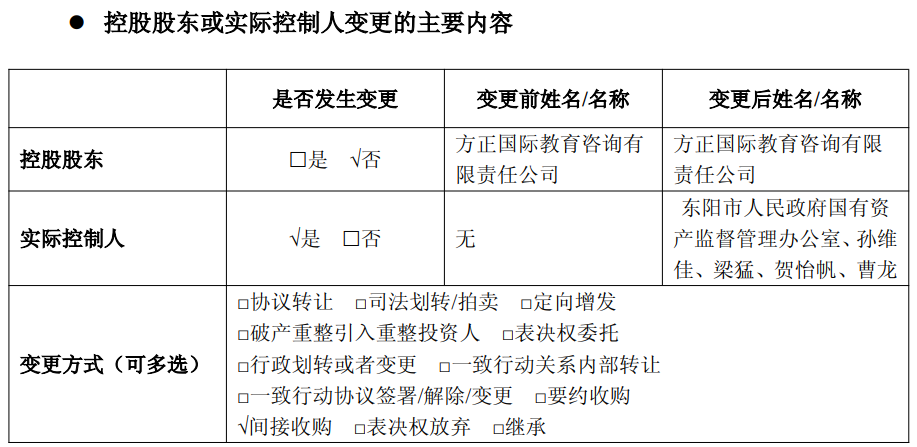 公告介绍,方正国际教育咨询有限责任公司(简称“方正国际教育”)是公司的直接控股股东,持有本公司无限售流通股117,482,984股,占公司总股本的20.03%。新方正控股发展有限责任公司(简称“新方正集团”)持有方正国际教育100%股权,为本公司的间接控股股东。2025年12月19日,新方正集团与湖北长江世禹芯玑半导体有限公司(简称“长江半导体”)签署了股权转让协议,约定新方正集团向长江半导体转让其所持有的方正国际教育100%股权。交易金额为12亿元。若本次股权转让完成,本公司直接控股股东未发生变更,仍为方正国际教育,长江半导体将成为公司的间接控股股东,公司的实际控制人将变更为东阳市人民政府国有资产监督管理办公室、孙维佳、梁猛、贺怡帆、曹龙。
