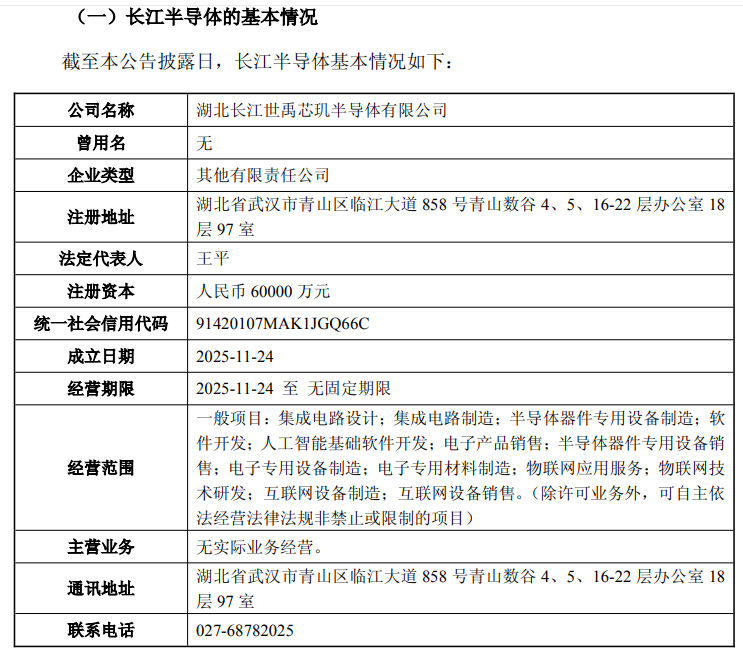 公告显示,长江半导体成立于2025年11月24日,至今尚不足一个月,公司注册资本6亿元,注册地位于武汉青山数谷,法定代表人为王平。公司经营范围涵盖集成电路设计、制造、半导体设备制造及销售、软件开发、物联网应用等,但“暂无实际业务经营”。