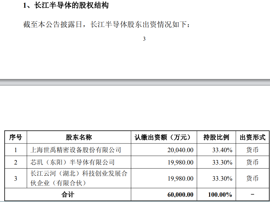 从股权结构看,截至本报告书签署日,上海世禹、芯玑半导体和长江云河分别持有长江半导体33.40%、33.30%和33.30%股权。