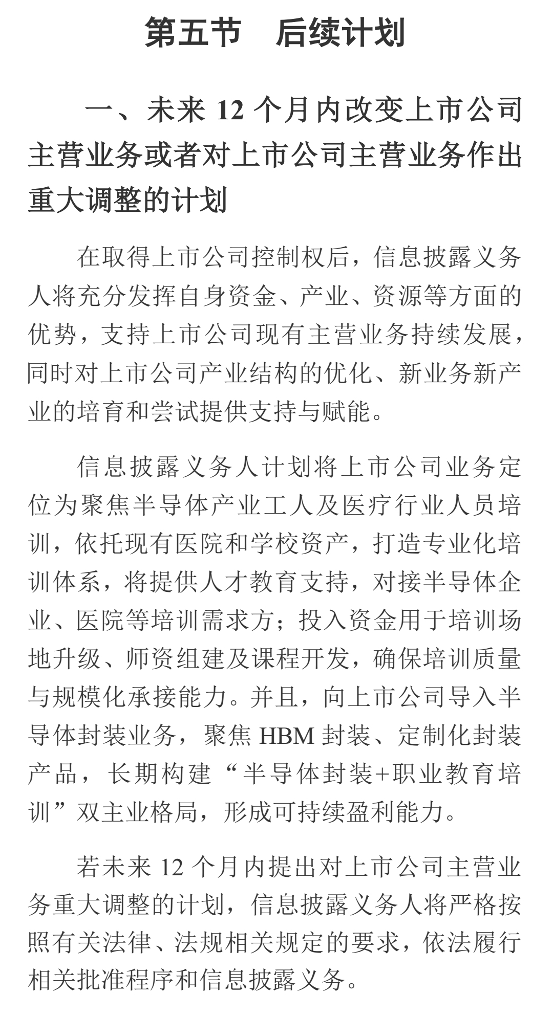 1. 主营业务聚焦与调整:信息披露义务人计划将上市公司业务定位为半导体产业工人及医疗行业人员培训,这表明公司未来将专注于这两个领域的培训业务,通过专业化培训体系的建立,提升人才教育支持,满足半导体企业、医院等培训需求方的需求。