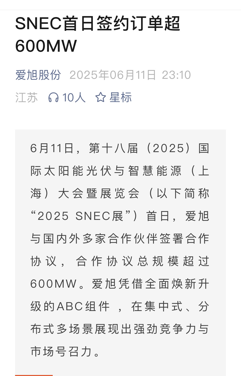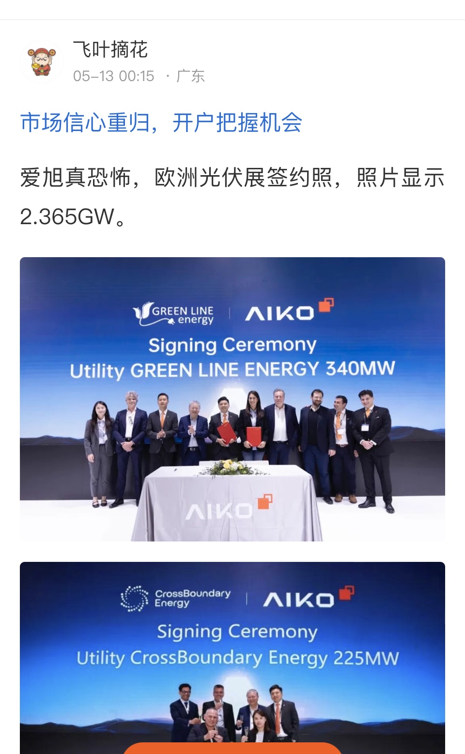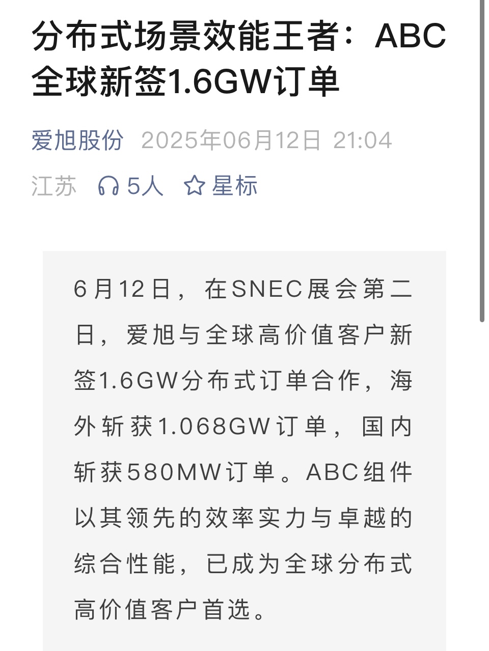 5月欧洲与6月上海光伏展共签订4.7GW光伏组件,其中国外订单超3.4GW,周六晚过爱旭珠海基地看看,灯都是亮的,传出机器听,个人判断全厂在加班。