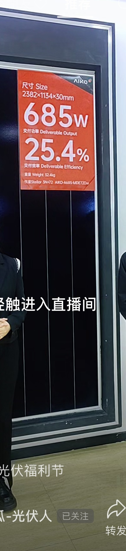 爱旭转效率25.5%690W~25.4%685W立上量产,爱旭ABC组件做阳台光伏。