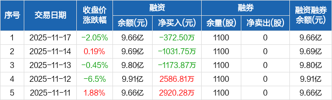 融资方面,当日融资买入4647.03万元,融资偿还5019.53万元,融资净偿还372.5万元,连续3日净偿还累计2578.12万元。融券方面,融券卖出0股,融券偿还0股,融券余量1100股,融券余额1.69万元。融资融券余额合计9.66亿元。
