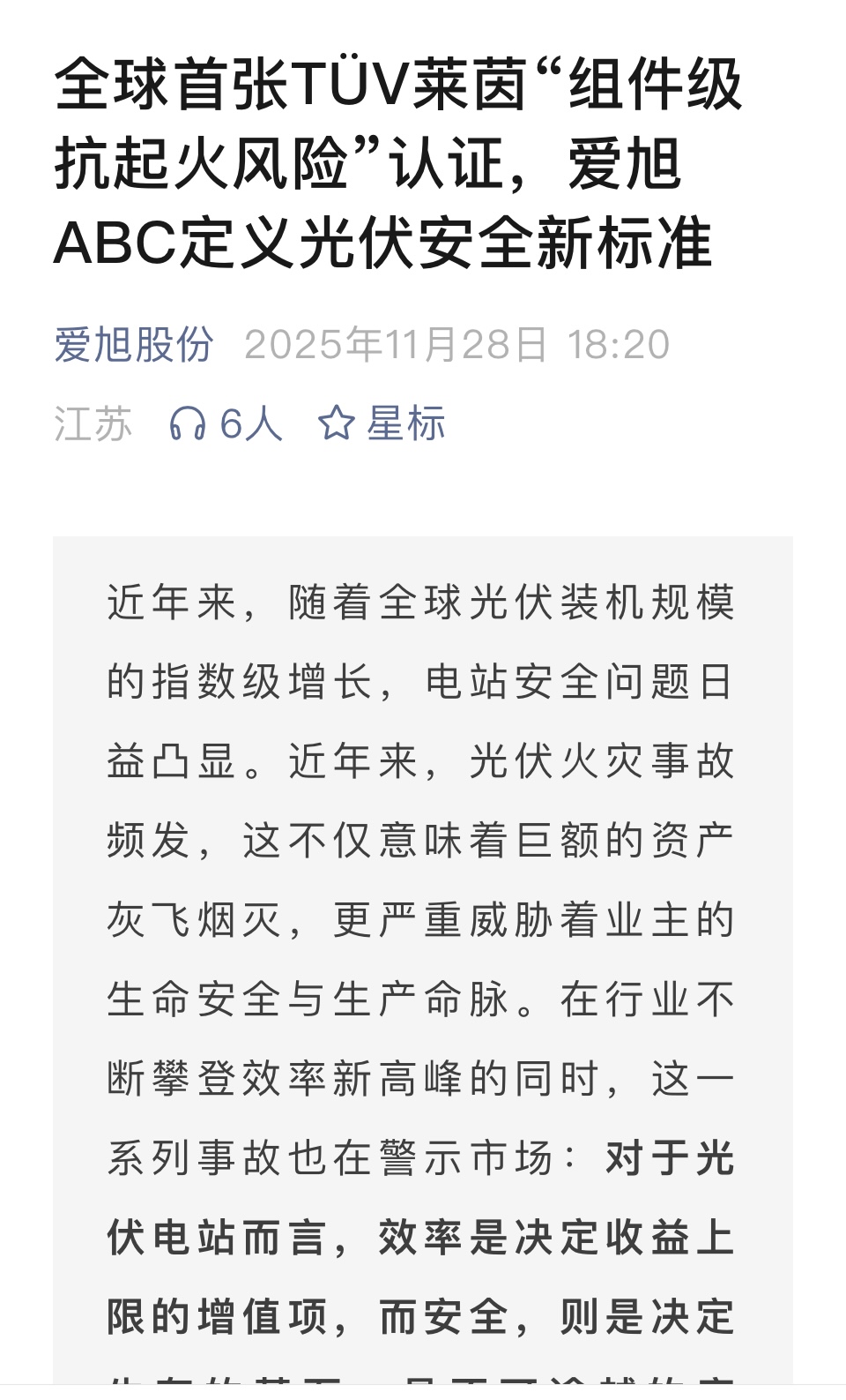 这份欧洲权威机构防火认识对于爱旭意思具大。防火对于人命与财产安全,这份认证一点也不敢做的,本月连续两日太阳能的火灾,为光伏火警安全,连续示警。