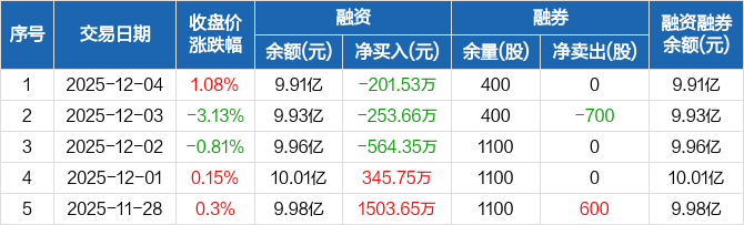 融资方面,当日融资买入1922.05万元,融资偿还2123.58万元,融资净偿还201.53万元,连续3日净偿还累计1019.54万元。融券方面,融券卖出0股,融券偿还0股,融券余量400股,融券余额5264元。融资融券余额合计9.91亿元。