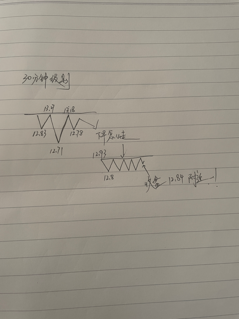午盘论股(不喜勿喷)下午怎么走~量化操盘情况下~如图!30分钟级别,12.93到