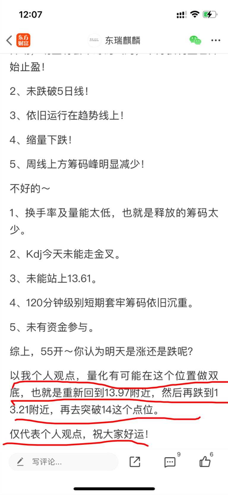 午盘论股(不喜勿喷)前天收盘已经说明了这个走势,今天打到13.96刚好在13.9