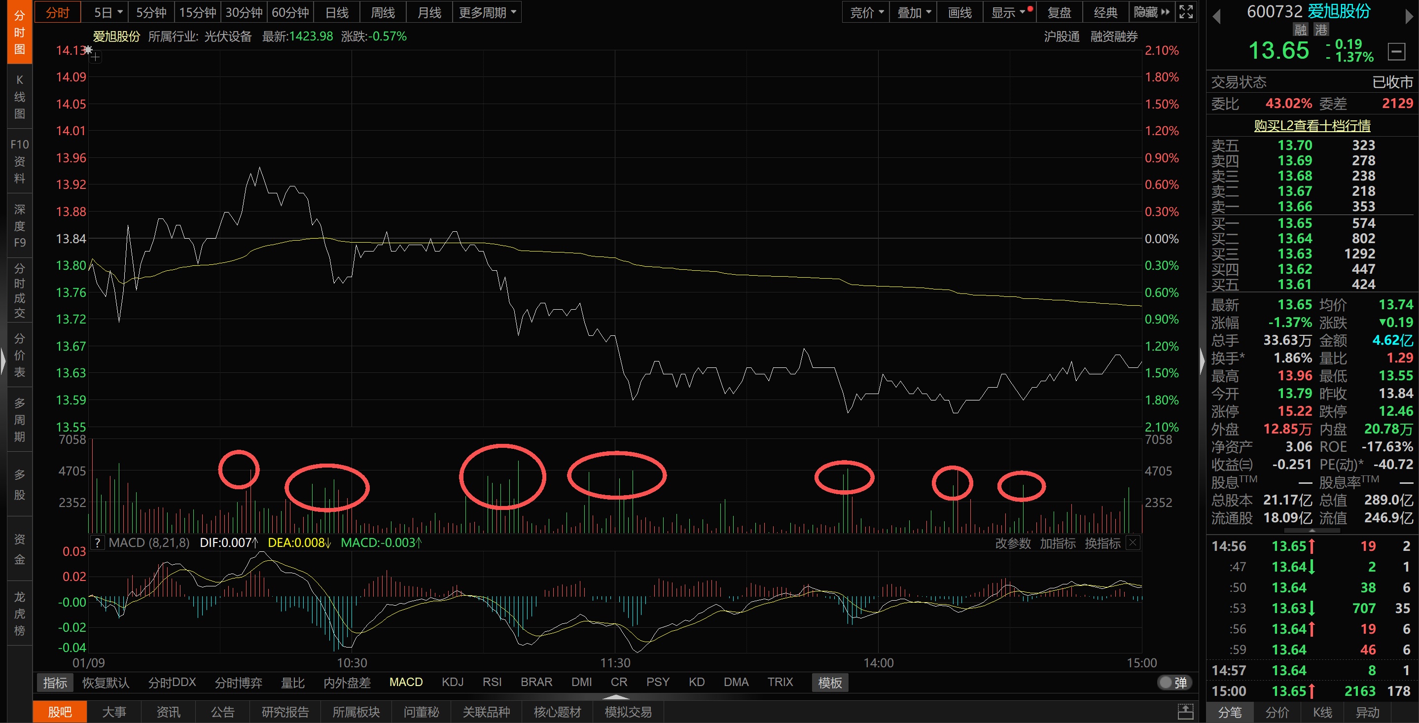 $爱旭股份(SH600732)$ 今天的走势估计会吓退一帮人,主力要的就是这效果。盘中异动量开始频繁出现,说明一点,离变盘的时间节点越来越近了,还是那句话,没站稳14块以前,一切都是空谈,这段在13.50-14.00元的震荡,做好高抛低吸吧!提醒一下,大盘成交量破了三万亿,也就意味着大盘风险高悬,越接近4200点,风险越大。年前一定会有波急杀,祝股友们好运!