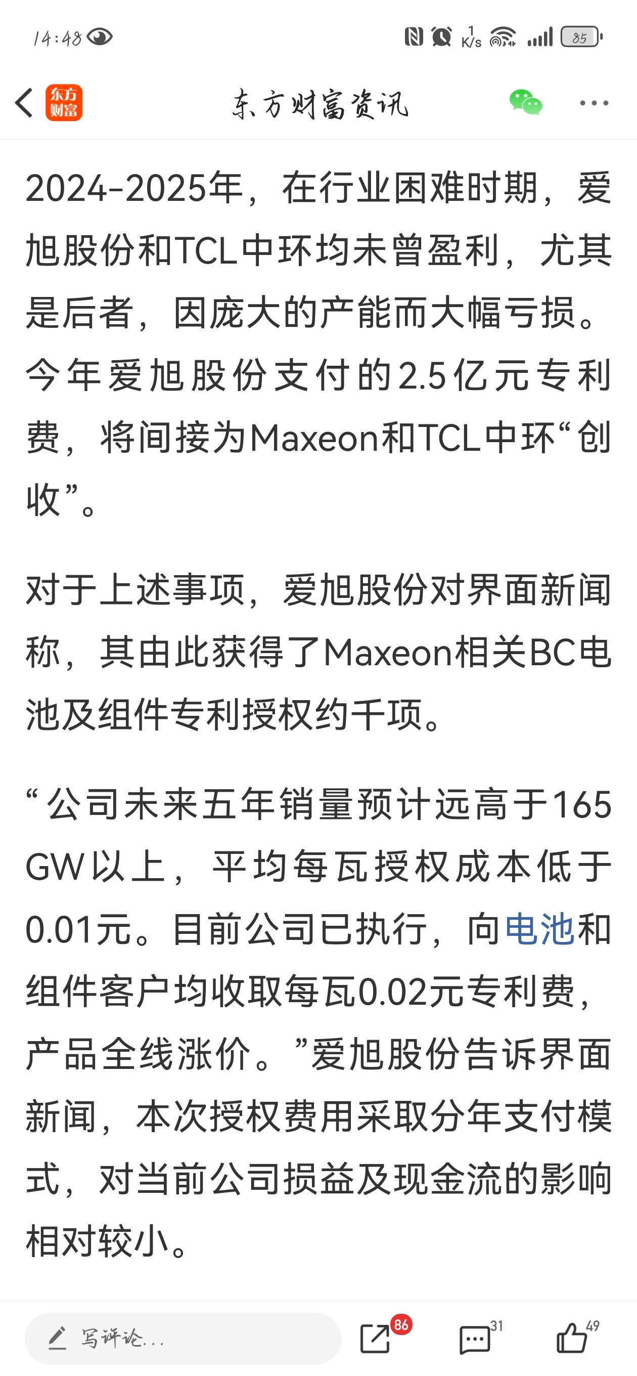 $爱旭股份(SH600732)$ 反手就收2分的专利费用!