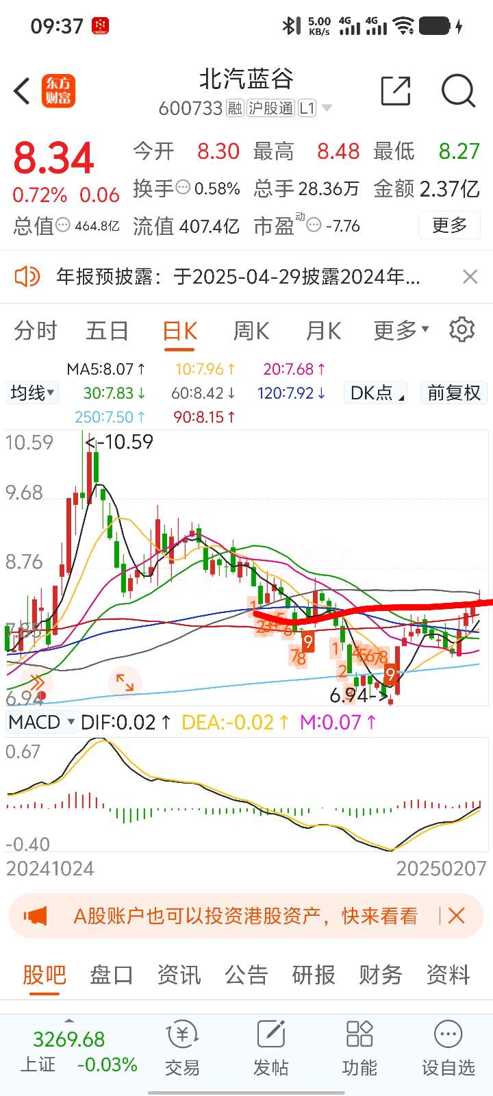 $北汽蓝谷(SH600733)$ 60日线摸一下,马d挂的8.45撤了