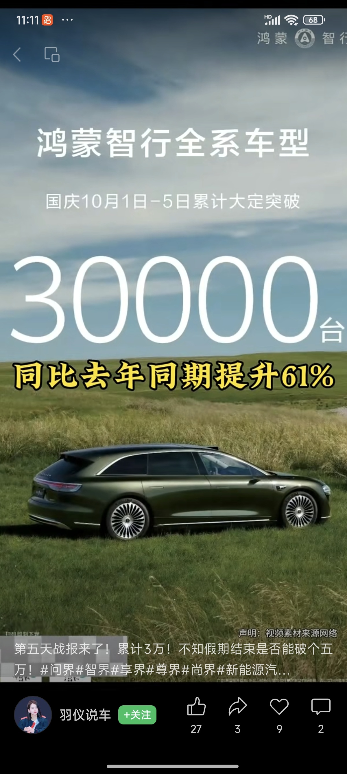 $北汽蓝谷(SH600733)$ $北京汽车(HK|01958)$ $奇瑞汽车(HK|09973)$ 华为五界国庆5日大定30000台,最美旅行车非享界s9T莫属