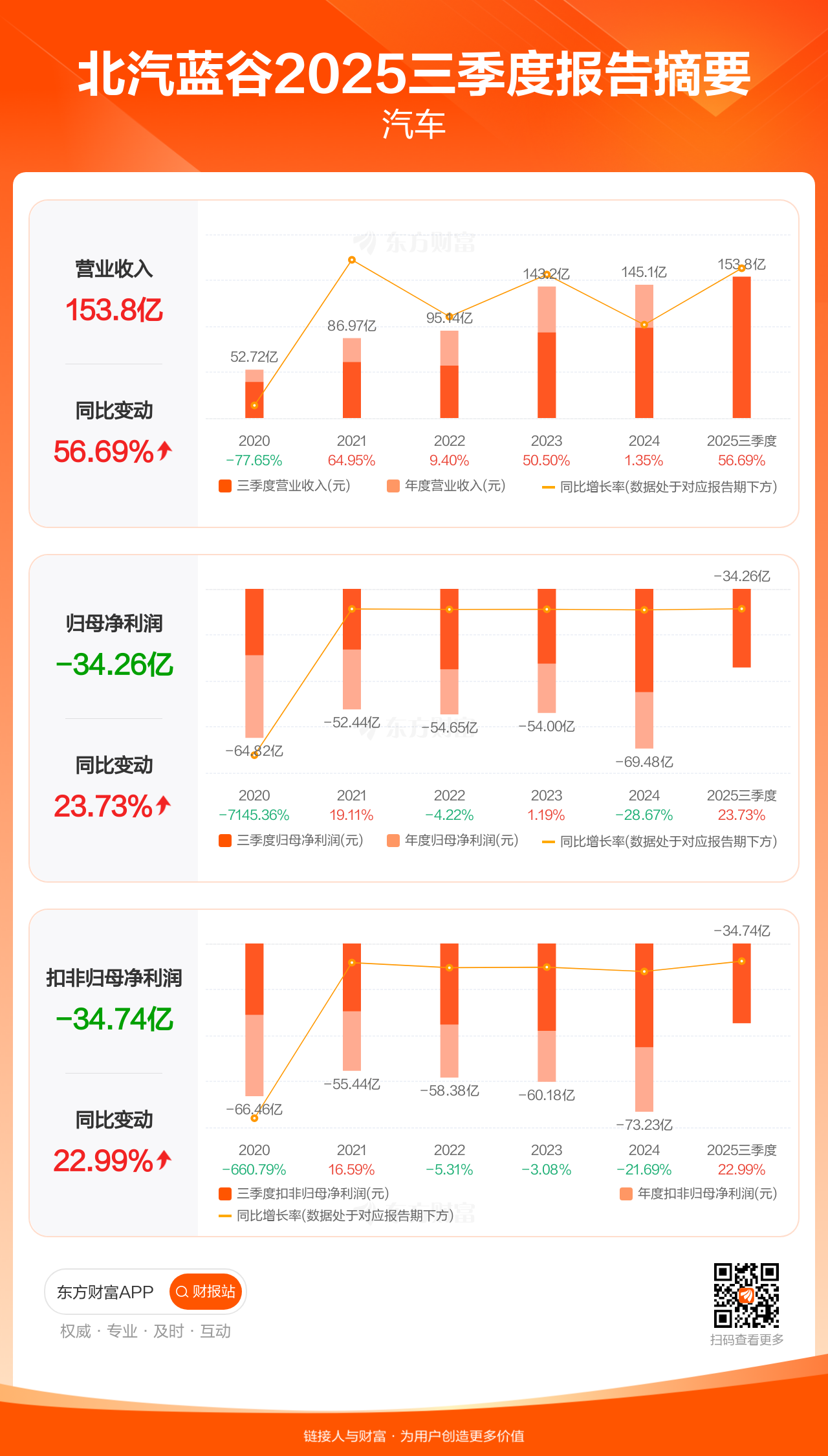 北汽蓝谷10月25日发布2025年三季报显示,公司前三季实现营业收入153.84亿元,同比增长56.69%;归母净利润-34.26亿元;扣非归母净利润-34.74亿元。