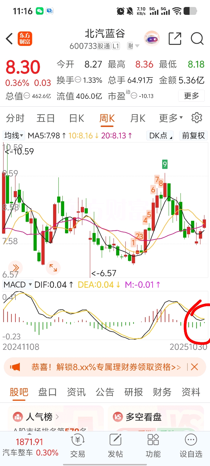 $北汽蓝谷(SH600733)$ 一个大阳线周线金叉趋势就来了就是不给曹