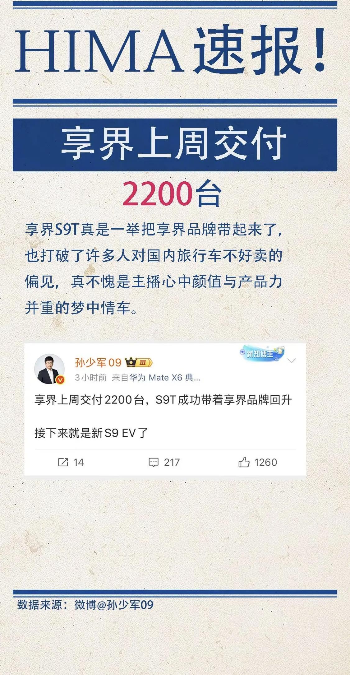 享界S9T成了!最新周交付2200台,新增周订单1750台,车媒预计11月销量可达10000~13000台!