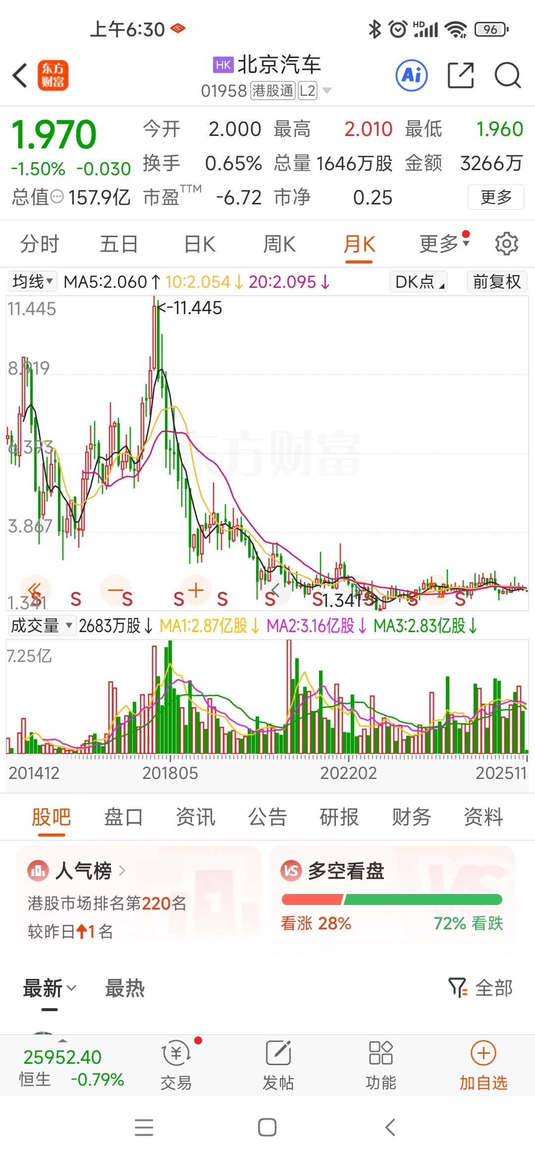 好多人对北汽抱着很大的希望,今天我就要刺破大家的幻想,北汽集团不尊重资本市场是有祖传基因的 港股北京汽车已经比众泰还低的价格 而且还在毫无支撑的下跌,这种企业为什么没有大资本青睐 是因为所有资本都清楚北汽的真正面目。