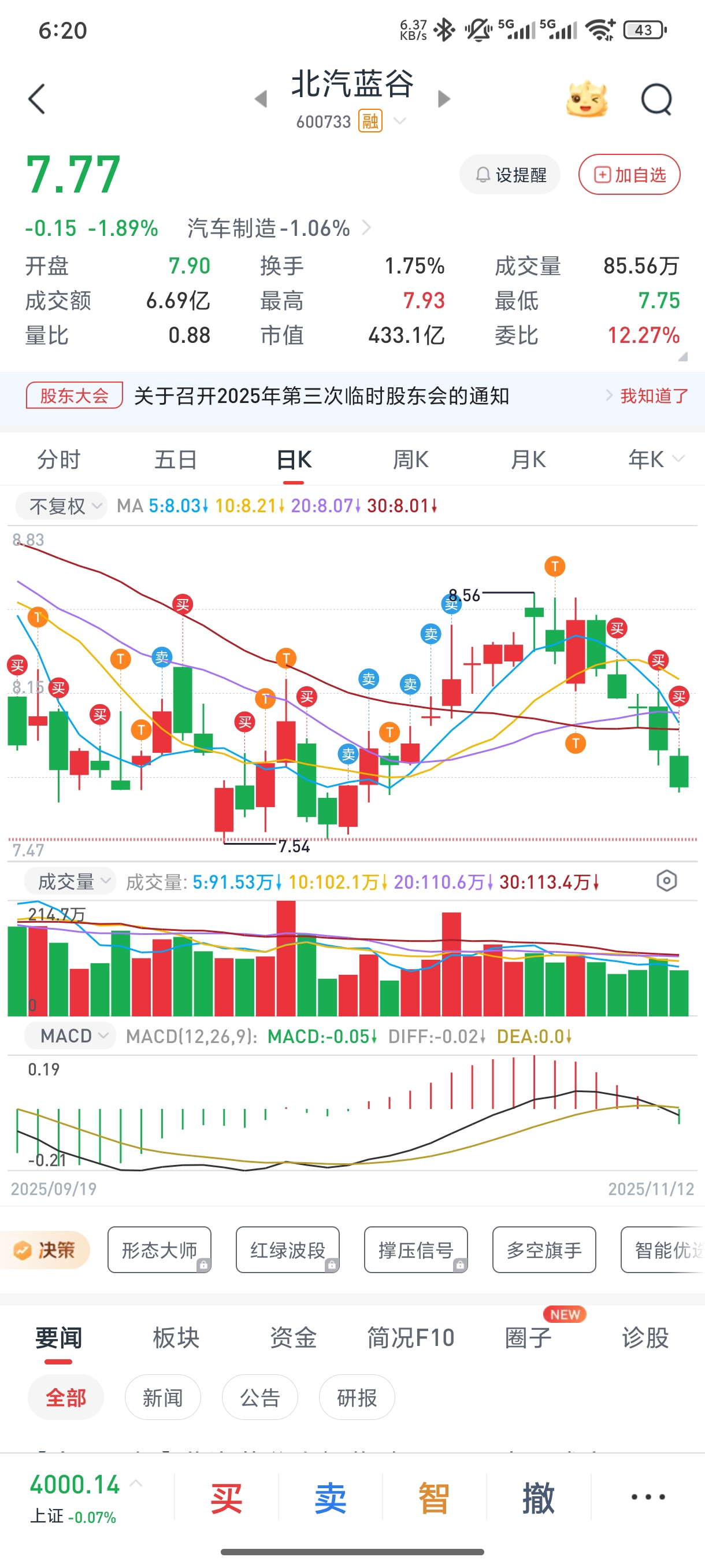 $北汽蓝谷(SH600733)$ 又加仓了。成本7.2了。希望让我吃个大的。7.6再加了