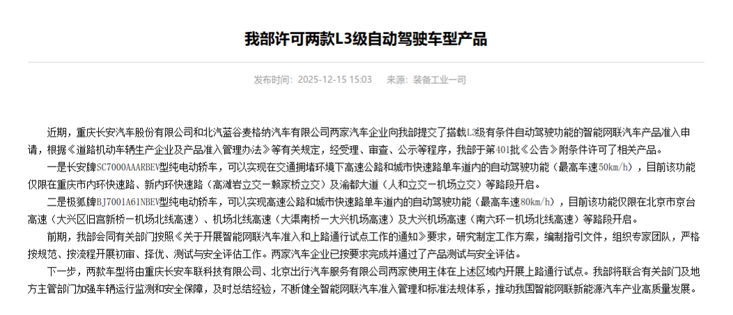 工业和信息化部已正式批准两款L3级自动驾驶车型获得市场准入许可,极狐就是其中之一