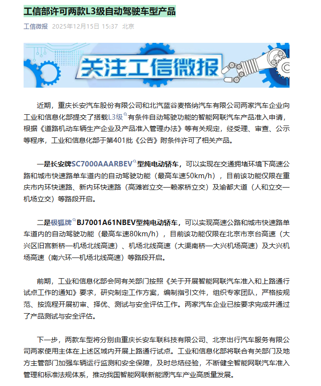 工信部第401批公告附条件许可L3级自动驾驶车型,极狐作为北汽旗下产品获准入场,这不仅是技术达标,也集中体现了体系安全、工程能力与监管信任。