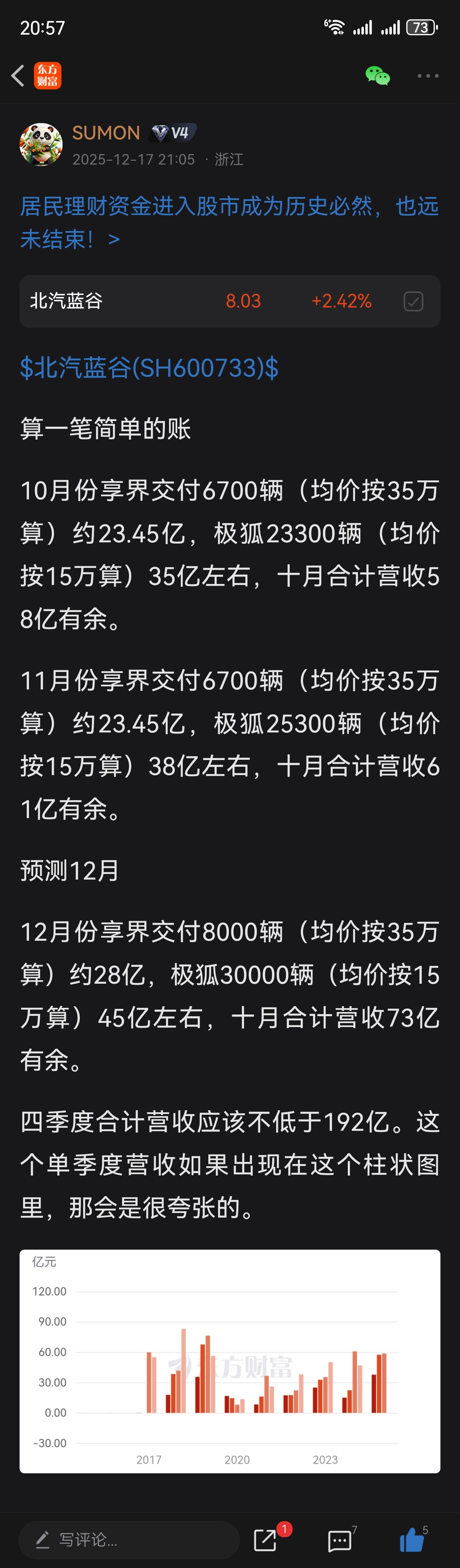 我在12.17预测享界12月交付8000,极狐30000的情况下,营收73亿左右