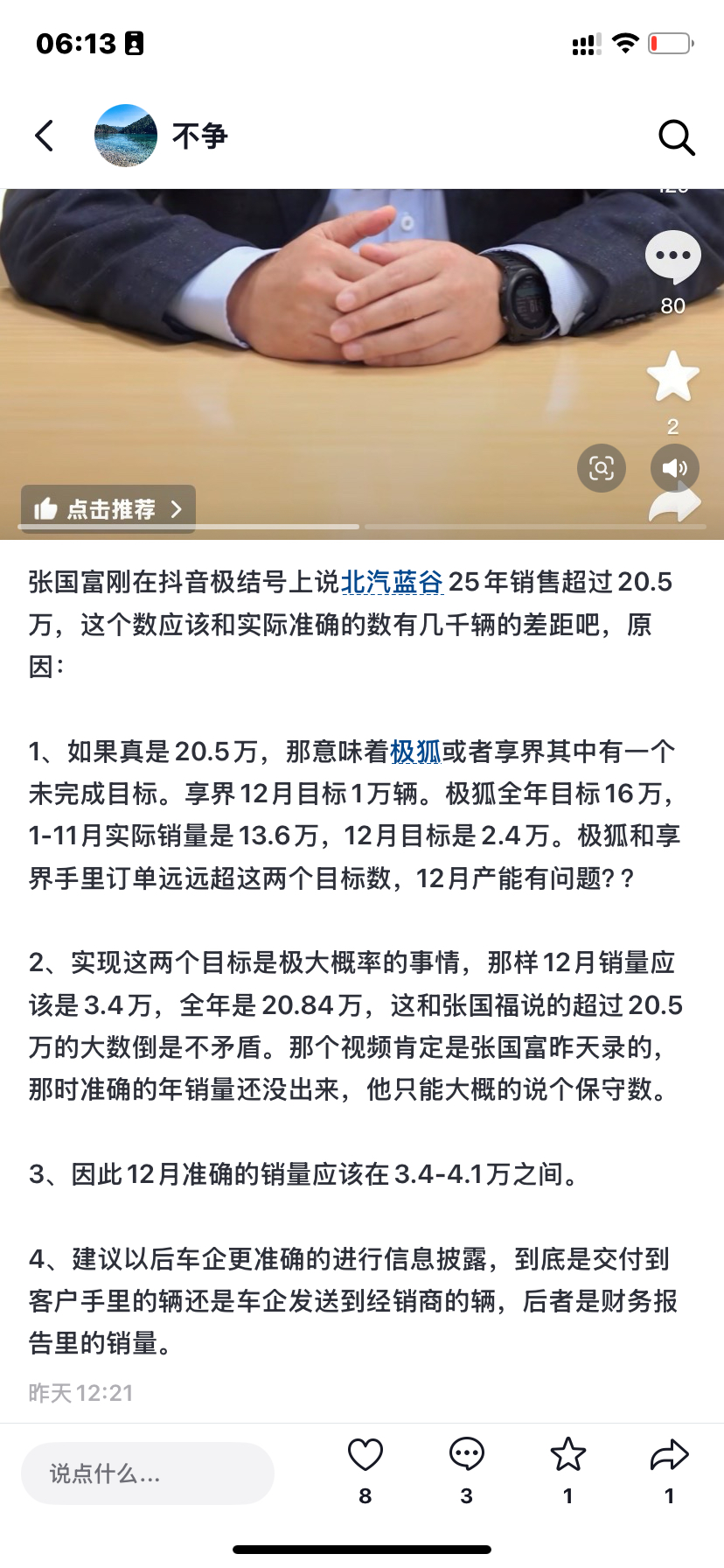 和我昨天判断的一样,张国富说的20.5万辆是一个保守的大概数,实际准确销量是209576辆,近21万辆。12月销量超3.5万,其中极狐超过2.4万,享界超过1万辆。