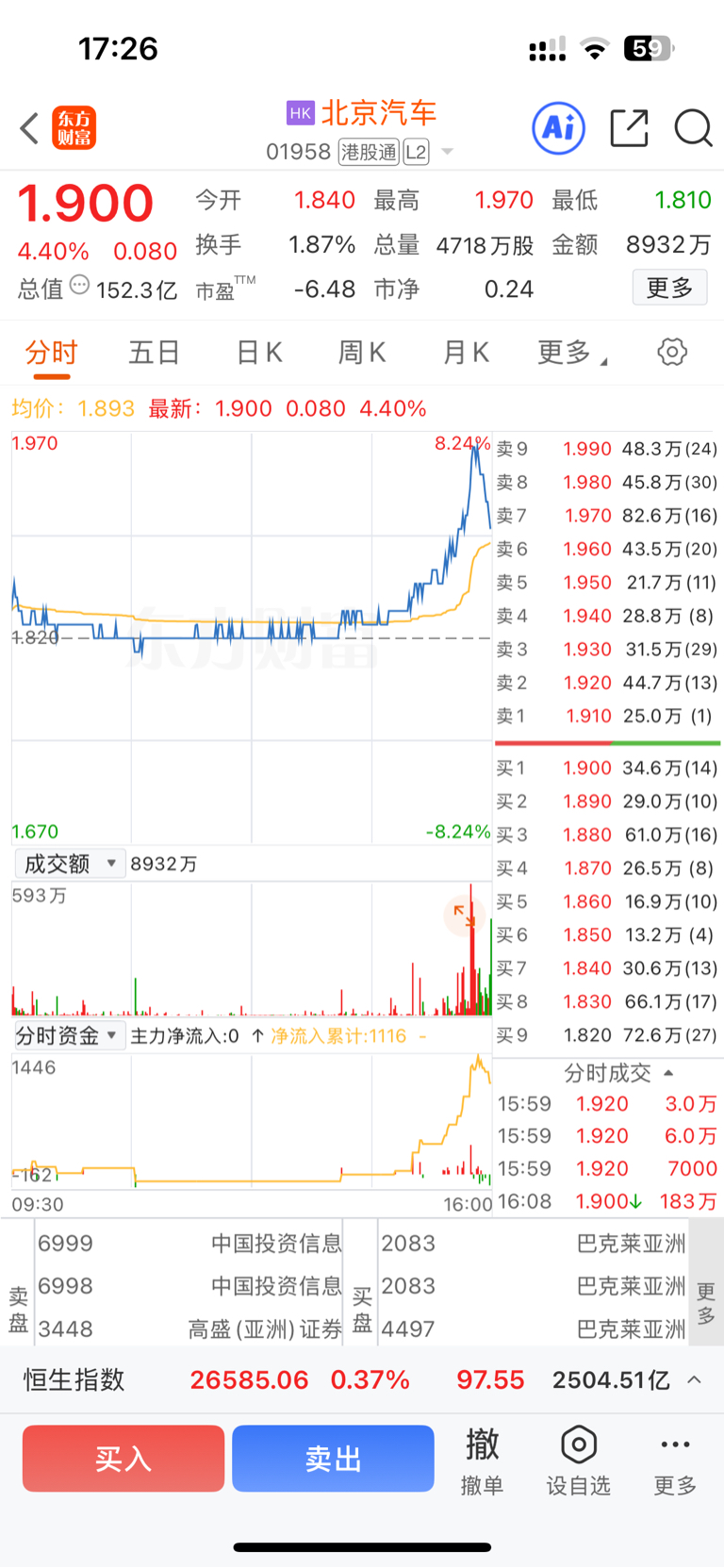 家人们,港股北京汽车尾盘大幅抢筹!大家怎么看?
