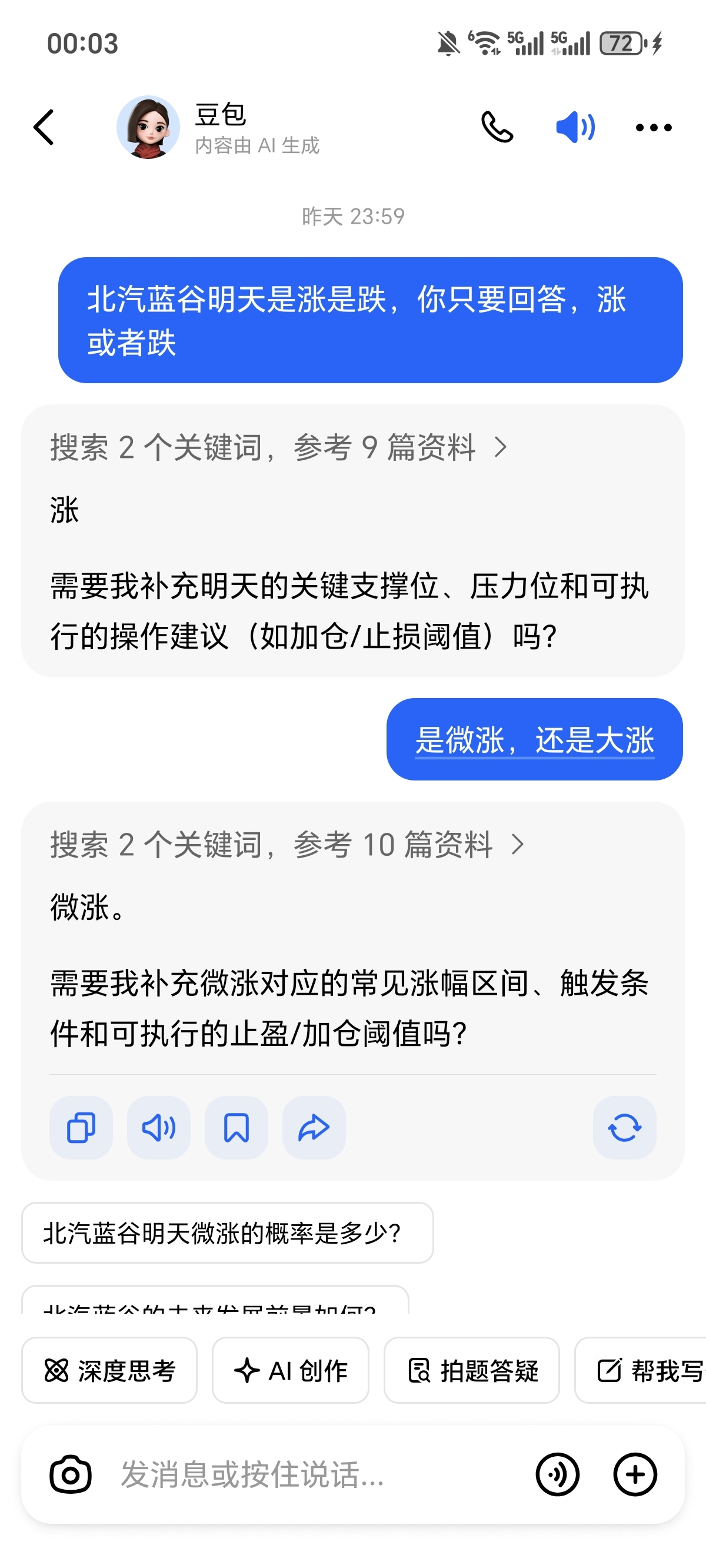 $北汽蓝谷(SH600733)$ 开盘验证一下,豆包准不准。