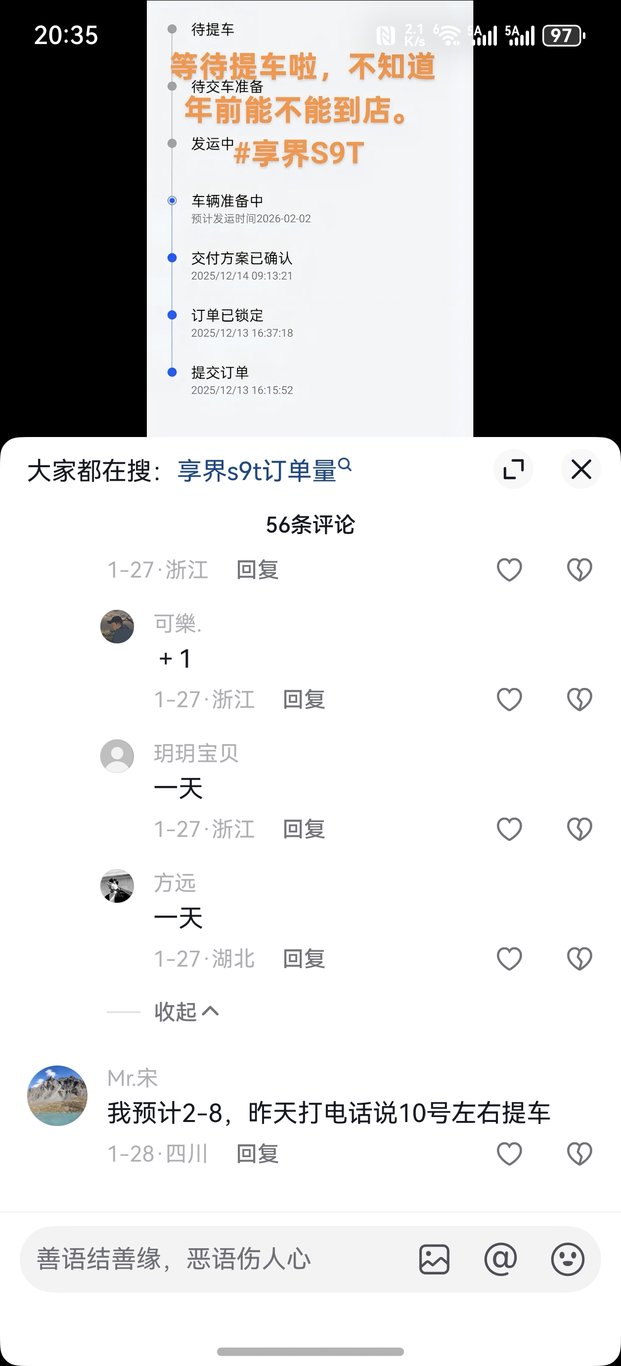 $北汽蓝谷(SH600733)$ 不知道北汽在干什么鸡腿,享界+极狐一个月8000台交付量,按道理应该还有2万台订单,但是享界交付只有估计4-5千,你说他完全没有订单,我搜了一下抖音,很多要2月才交付