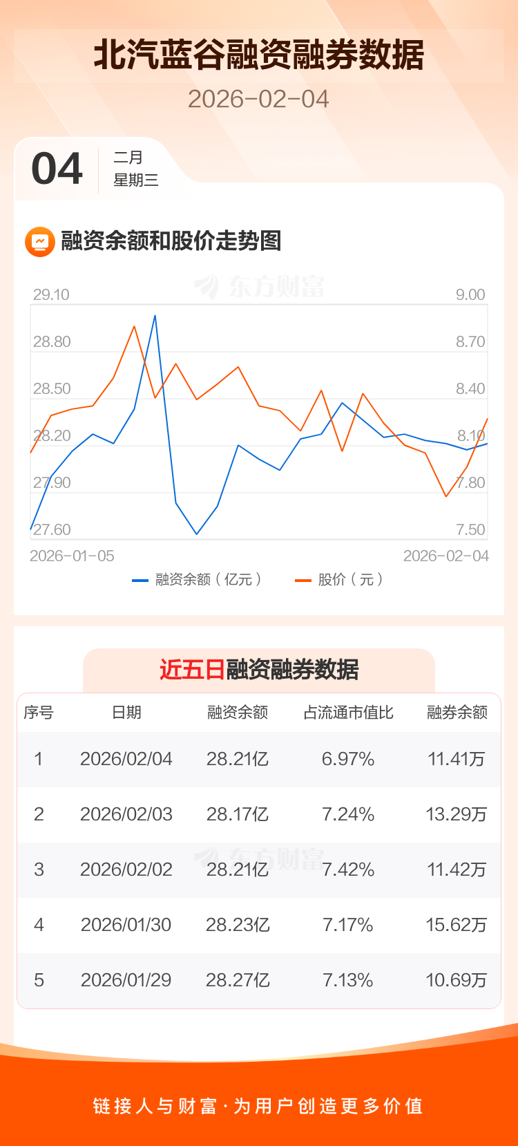 交易所最新数据显示,北汽蓝谷于2026年2月4日获融资买入1.32亿元,融资偿还1.29亿元,当日融资净买入342.47万元。目前,该股融资余额28.21亿,占流通市值比例为6.97%。