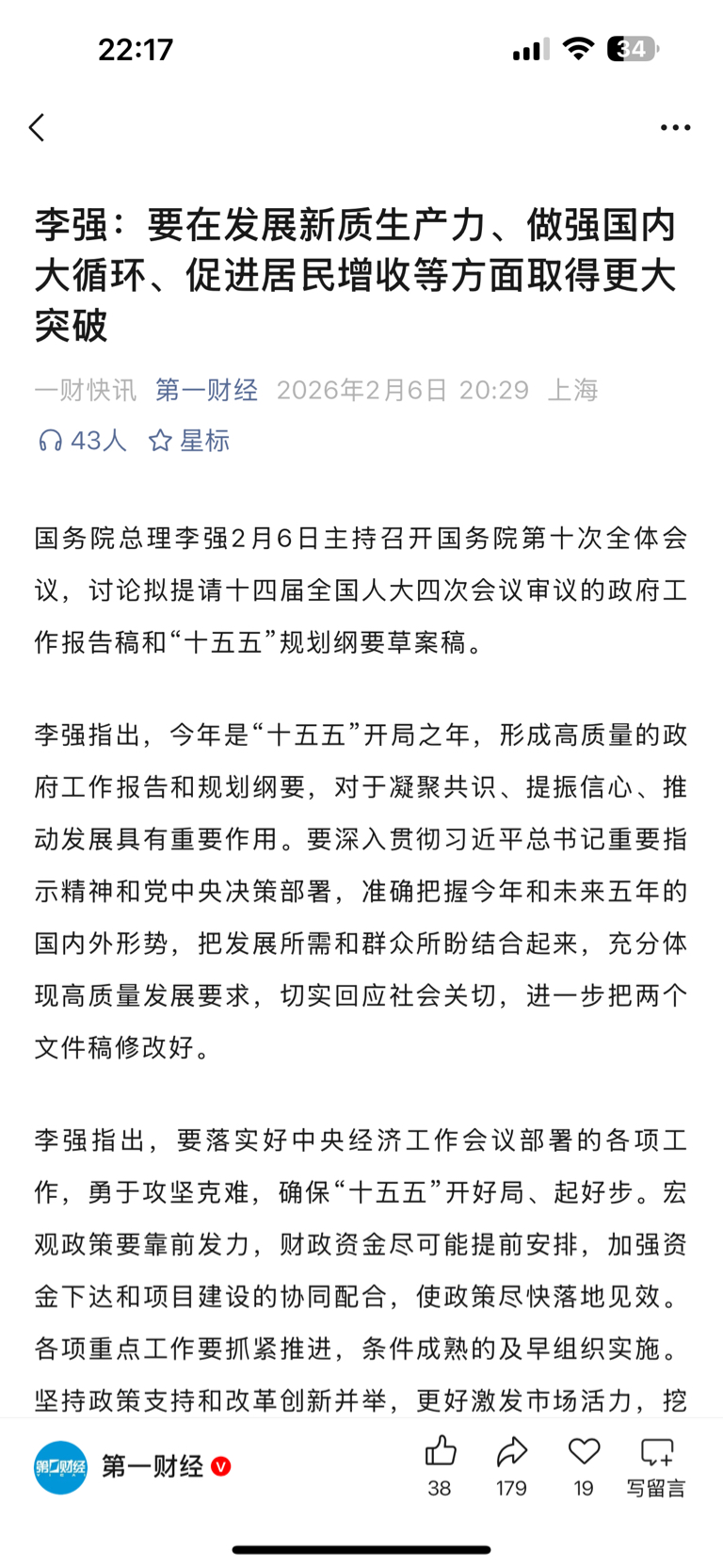 一万年太久,只争朝夕。股友们,温馨提示:2月6日,国常会研究促投资,重点领域谋划一批重大项目。求是:如何理解我国金融“大而不强”?当地时间2月6日,特朗普签署行政命令,对与伊朗有贸易往来的国家征收关税。历史性时刻!道指首次站上50000点,特朗普发文祝贺,预计到其本届任期结束时,道指将站上10万点。截至美股最新收盘,道琼斯工业平均指数上涨2.47%,报50115.67点,创历史新高收盘纪录;标普500指数上涨1.97%,报6932.30点;纳斯达克综合指数上涨2.18%,报23031.21点。2月6日,国家卫生健康委发布了《食品安全国家标准 预制菜》(征求意见稿),面向社会公开征求意见。其中标准明确,预制菜不包括主食类食品、净菜类食品、即食食品和中央厨房制作的菜肴。2月6日,预制菜相关国标及餐饮明示公告征求意见稿公布,系回应西贝事件后的公众关切。人民日报称吃得放心是预制菜的金标准,新规设食品安全红线、保障消费者知情权,也将促进行业健康发展。2月7日,我国在酒泉卫星发射中心使用长征二号F运载火箭,成功发射一型可重复使用试验航天器。试验航天器将按计划开展可重复使用试验航天器技术验证,为和平利用太空提供技术支撑。证监会6日通报2025年首发企业现场检查情况称,2025年全年完成16家随机抽取及4家问题导向企业检查处理工作,涉及主板企业8家、科创板企业9家以及创业板企业3家。从全年检查情况看,新受理企业申报质量进一步提升,“一查就撤”等市场乱象得到根本扭转。首飞成功!汽车飞机二合一!2月6日,由中国航天科技集团九院研制的全国首款航天造电动垂直起降低空飞行器,在重庆永川大安机场首飞成功,圆满完成各项性能验证。据国家数据局2月7日消息,国家数据局、工业和信息化部、公安部、中国证监会等部门发布《关于培育数据流通服务机构加快推进数据要素市场化价值化的意见》,提出支持数据流通服务机构加快提升服务能力和水平,探索创新数据流通交易模式,加大高质量数据产品和服务供给,促进数据安全合规高效流通交易。月6日下午消息,工信部发布《关于组织开展国家算力互联互通节点建设工作的通知》,面向国家枢纽节点、重大战略区域、重点行业建设算力互联互通节点,构建国家算力互联互通节点体系。近日,工业和信息化部组织制定的强制性国家标准《汽车车门把手安全技术要求》(GB 48001-2026)由国家市场监督管理总局、国家标准化管理委员会批准发布,将于2027年1月1日起开始实施。北京时间周六,2026年米兰-科尔蒂纳冬奥会正式揭幕。恰逢贵金属市场异动,今年的奥运金牌物料价值也创出历史之最。按照周五现货黄金和白银的收盘价计算,米兰冬奥会金牌(500克纯银+6克镀金)的物料价值达到2210美元,而银牌(500克纯银)的价值也达到1251美元。中国科学院西双版纳热带植物园与云南铜壁关省级自然保护区管护局日前联合发表夹竹桃科醉魂藤属一新物种——铜壁关醉魂藤,相关研究结果2月5日已在国际植物分类学期刊《植物分类》(Phytotaxa)上发表。云南铜壁关省级自然保护区管护局助理工程师杨荣聪说,在以往的研究中,醉魂藤属中的部分物种具有一定的药用价值,民间多用于催乳、除湿、解毒、截疟等。但铜壁关醉魂藤的药用价值尚有待研究开发。
