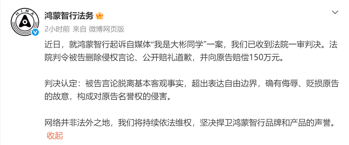 2月11日,鸿蒙智行法务官方微博发文称,近日,就鸿蒙智行起诉自媒体“我是大彬同学”一案,我们已收到法院一审判决。法院判令被告删除侵权言论、公开赔礼道歉,并向原告赔偿150万元。判决认定:被告言论脱离基本客观事实,超出表达自由边界,确有侮辱、贬损原告的故意,构成对原告名誉权的侵害。