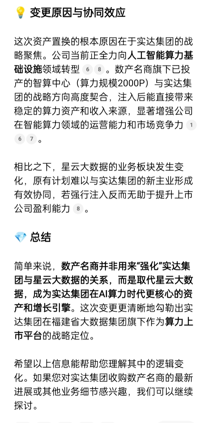 数产名商与实达集团在人工智能算力基础设施方面的战略布局更加契合。实达集团正在向"算力+数据+教育+AI"四位一体的战略方向聚焦,数产名商的智算中心资产更能直接增强实达集团在智能算力领域的竞争力。