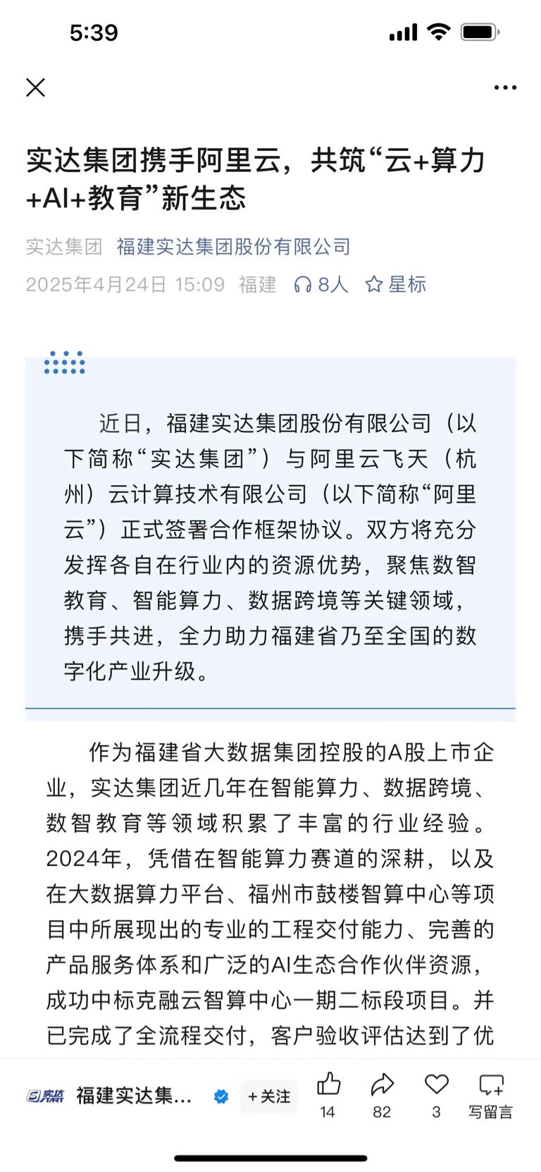 $实达集团(SH600734)$ 算力+阿里+海西。明天继续板,换手板最好。