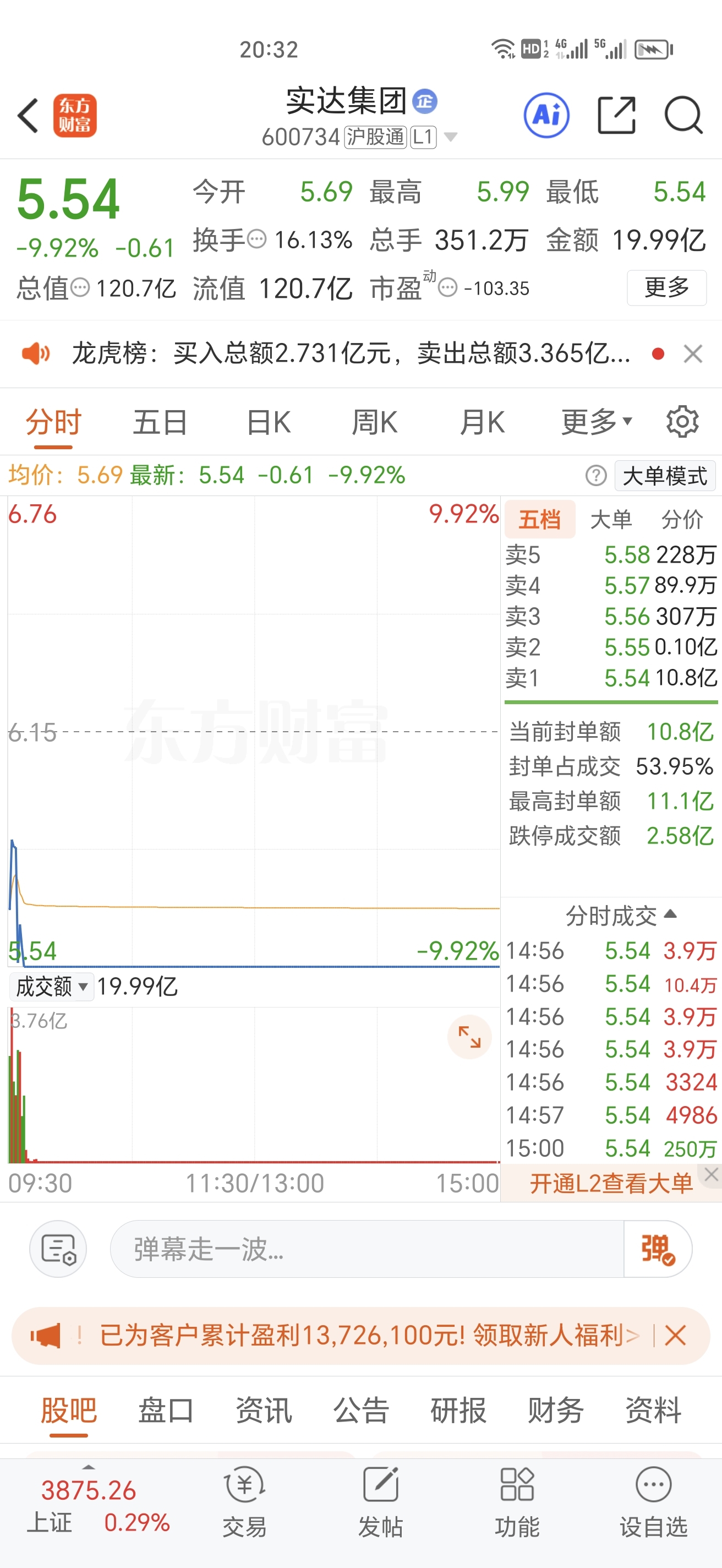 $实达集团(SH600734)$ 10亿封单,还有人唱多,想想下周几出来吧。唉。10亿是真金白银,有钱人没有哪个是蠢子。散户唱多,10亿金主在卖。不知谁对谁错。