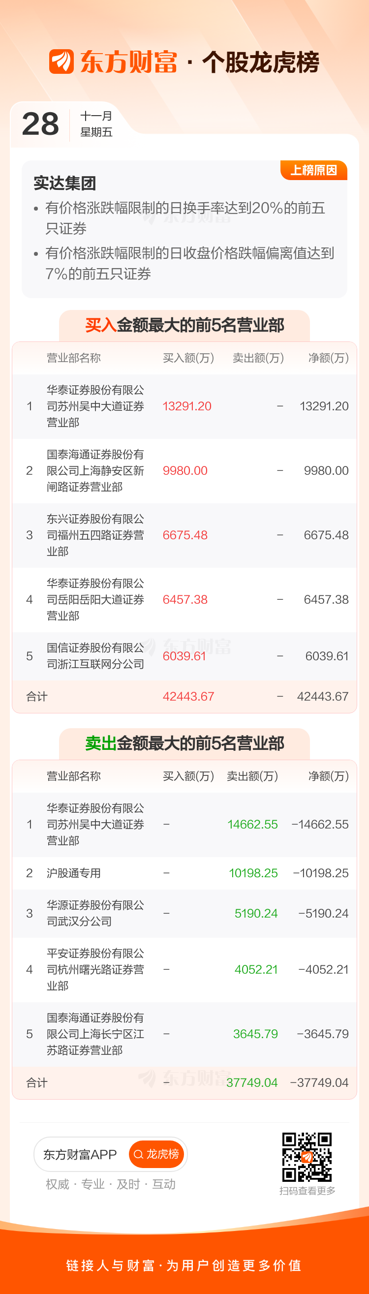 交易所2025年11月28日公布的交易公开信息显示,实达集团因成为有价格涨跌幅限制的日换手率达到20%的前五只证券、有价格涨跌幅限制的日收盘价格跌幅偏离值达到7%的前五只证券上榜。实达集团当日收报5.08元,涨跌幅-8.30%,偏离值39.26%,换手率39.26%,成交额44.19亿。