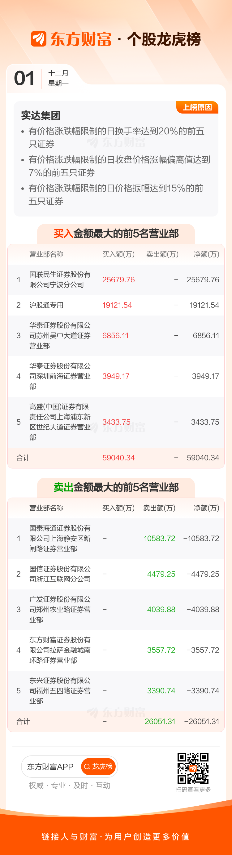 交易所2025年12月1日公布的交易公开信息显示,实达集团因成为有价格涨跌幅限制的日换手率达到20%的前五只证券、有价格涨跌幅限制的日收盘价格涨幅偏离值达到7%的前五只证券、有价格涨跌幅限制的日价格振幅达到15%的前五只证券上榜。实达集团当日收报5.59元,涨跌幅10.04%,偏离值29.32%,换手率29.32%,成交额33.47亿。