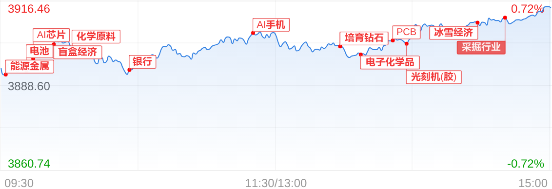 A股三大指数中创业板指领涨,截至收盘,上证指数上涨0.65%,深证成指上涨1.25%,创业板指上涨1.31%,北证50指数上涨1.52%。沪深两市成交额18739.38亿元,较上个交易日放量2881.42亿。全市场3398只个股上涨。板块题材上,AI手机、屏下摄像、EDA概念板块涨幅居前,DRG/DIP、钛白粉、数字水印板块跌幅居前。大盘表现
