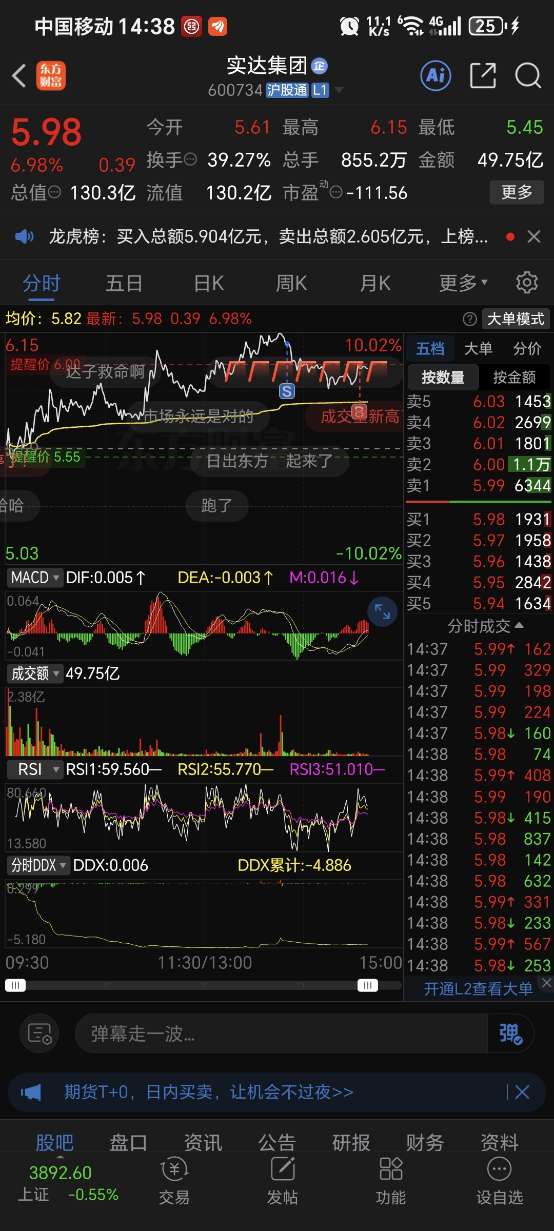$实达集团(SH600734)$ 他敢拉升,我就赶上