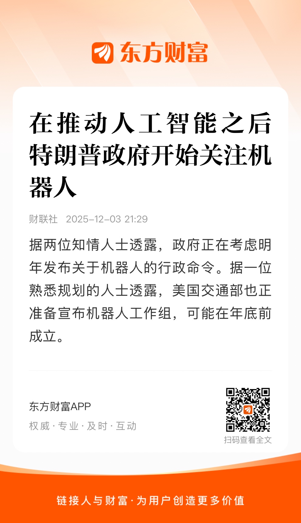 据报道,在发布加速人工智能发展计划五个月后,特朗普政府开始转向机器人。据三位知情且匿名透露细节的人士透露,美国商务部长霍华德·卢特尼克一直在与机器人行业的CEO会面,并全力以赴加速行业发展。据两位知情人士透露,政府正在考虑明年发布关于机器人的行政命令。据一位熟悉规划的人士透露,美国交通部也正准备宣布机器人工作组,可能在年底前成立。该部门发言人未回应置评请求。